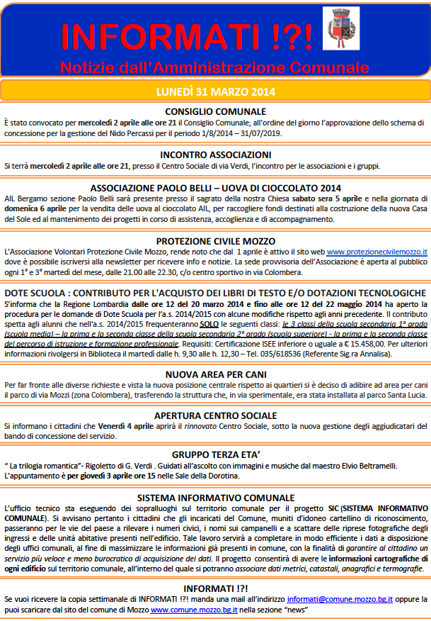 Mozzo/Comune: INFORMATI del 31 marzo 2014 admin1 aprile 20141 aprile 2014blog post Navigazione articoli PrecedenteContinua Condividi:CondivisioneTweet Fai clic qui per stampare (Si apre in una nuova finestra) Stampa Fai clic per inviare un link a un amico via e-mail (Si apre in una nuova finestra) E-mail Mi piace Caricamento... Correlati