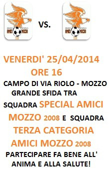 Mozzo/Calcio Venerdì 25 aprile: la grande sfida! « AMICI MOZZO 2008 Football Club admin24 aprile 201424 aprile 2014blog post Navigazione articoli PrecedenteContinua Venerdì 25 aprile: la grande sfida! « AMICI MOZZO 2008 Football Club. Allenamento degli aquilotti Special per il derby di venerdì. Con supervisore d’eccezione! « AMICI MOZZO 2008 Football Club. Condividi:CondivisioneTweet Fai clic qui per stampare (Si apre in una nuova finestra) Stampa Fai clic per inviare un link a un amico via e-mail (Si apre in una nuova finestra) E-mail Mi piace Caricamento... Correlati