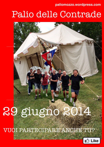 Mozzo/Palio: Tutti al Palio 2014! | Palio delle Contrade di Mozzo admin27 Maggio 201422 Maggio 2014blog post Navigazione articoli PrecedenteContinua Tutti al Palio 2014! | Palio delle Contrade di Mozzo. Qui. Condividi:CondivisioneTweet Fai clic qui per stampare (Si apre in una nuova finestra) Stampa Fai clic per inviare un link a un amico via e-mail (Si apre in una nuova finestra) E-mail Mi piace Caricamento... Correlati