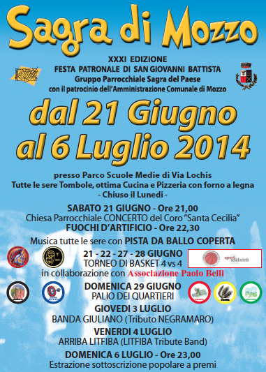 Mozzo/Sagra: Sabato apre la festa di Mozzo in occasione dei festeggiamenti patronali. admin19 giugno 201419 giugno 2014blog post Navigazione articoli PrecedenteContinua . Condividi:CondivisioneTweet Fai clic qui per stampare (Si apre in una nuova finestra) Stampa Fai clic per inviare un link a un amico via e-mail (Si apre in una nuova finestra) E-mail Mi piace Caricamento... Correlati