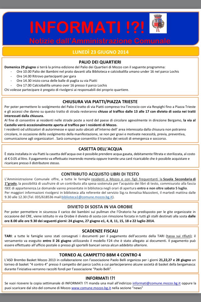 Mozzo/Comune: INFORMATI DEL 23 giugno 2014 admin24 giugno 201424 giugno 2014blog post Navigazione articoli PrecedenteContinua . Condividi:CondivisioneTweet Fai clic qui per stampare (Si apre in una nuova finestra) Stampa Fai clic per inviare un link a un amico via e-mail (Si apre in una nuova finestra) E-mail Mi piace Caricamento... Correlati