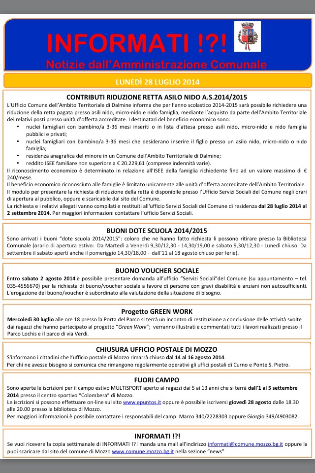 Mozzo/Comune: INFORMATI DEL 29 luglio 2014 admin29 luglio 2014blog post Navigazione articoli PrecedenteContinua Condividi:CondivisioneTweet Fai clic qui per stampare (Si apre in una nuova finestra) Stampa Fai clic per inviare un link a un amico via e-mail (Si apre in una nuova finestra) E-mail Mi piace Caricamento... Correlati