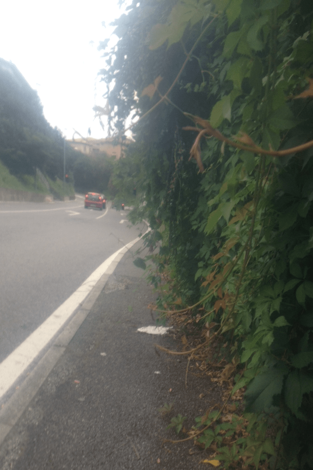 “Come tutti gli anni il marciapiede verso le fermate del bus e’ invaso dalle sterpaglie e obbliga gli studenti a scendere sulla strada con il rischio di essere travolti dalle auto sempre in corsa negli orari di punta. Speriamo che il comune provveda in tempo contro questa giungla…”
