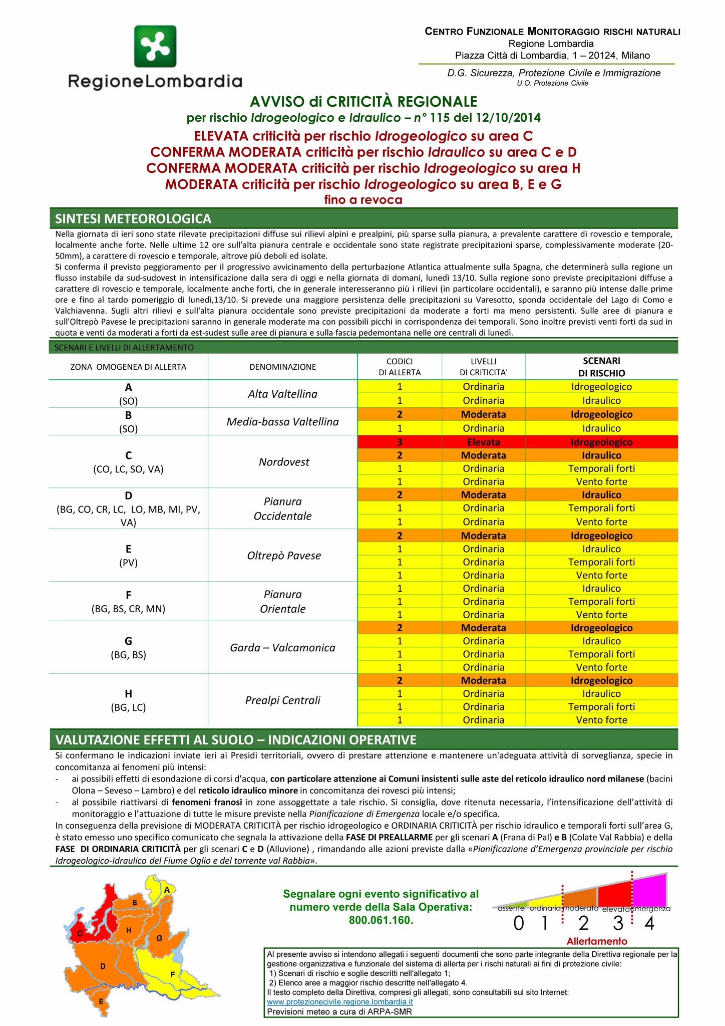 Si trasmette l’avviso di Criticità Regionale diramato dal Dipartimento di Protezione Civile Regione Lombardia
