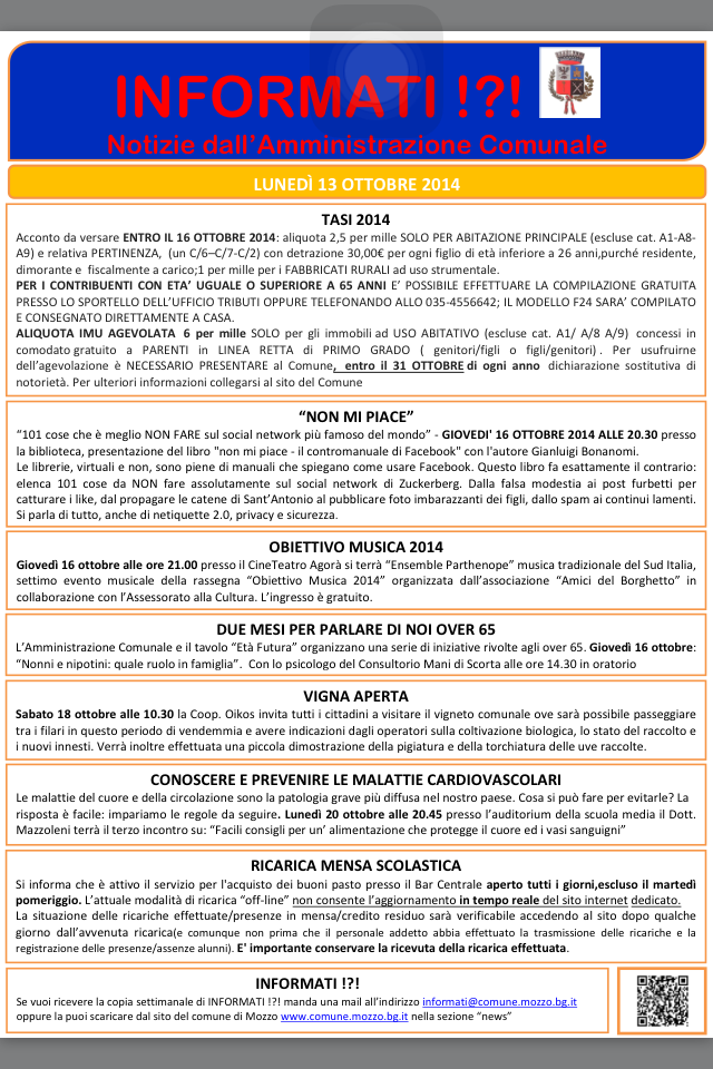 Mozzo/Comune: INFORMATI DEL 13 ottobre 2014 admin14 ottobre 201413 ottobre 2014blog post Navigazione articoli PrecedenteContinua Condividi:CondivisioneTweet Fai clic qui per stampare (Si apre in una nuova finestra) Stampa Fai clic per inviare un link a un amico via e-mail (Si apre in una nuova finestra) E-mail Mi piace Caricamento... Correlati
