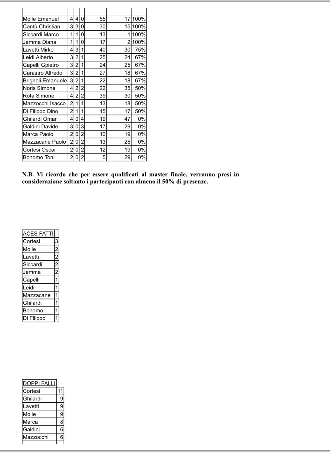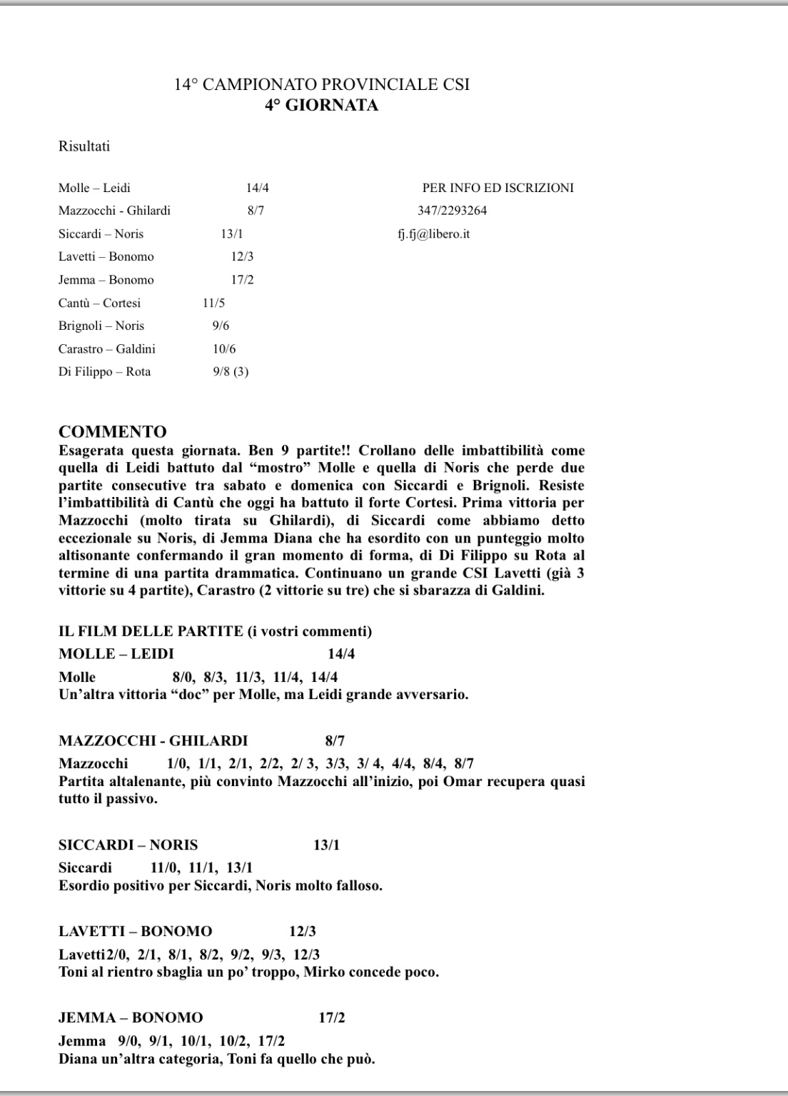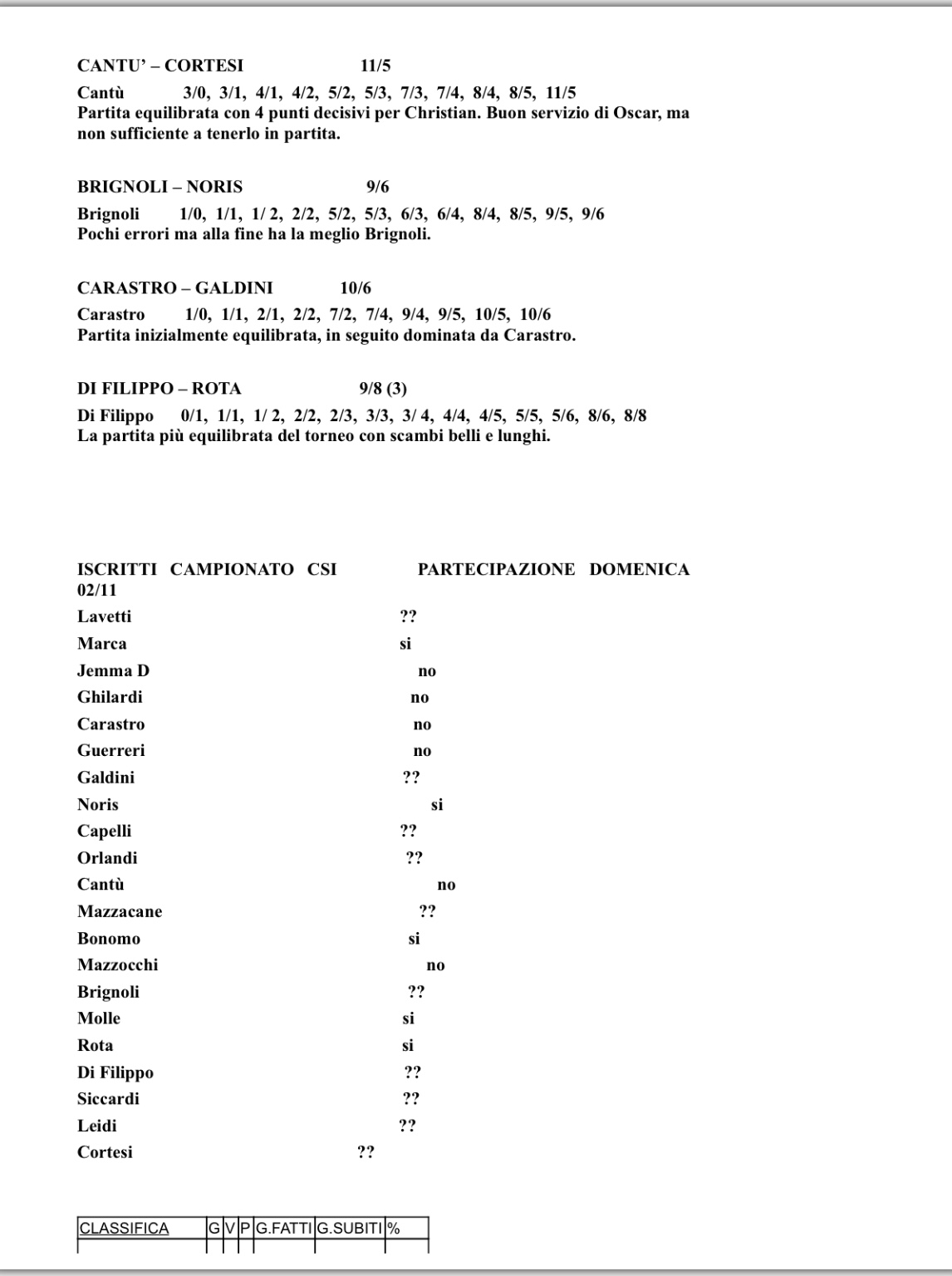 Esagerata questa giornata. Ben 9 partite!! Crollano delle imbattibilità come quella di Leidi battuto dal “mostro” Molle e quella di Noris che perde due partite consecutive tra sabato e domenica con Siccardi e Brignoli. Resiste l’imbattibilità di Cantù che oggi ha battuto il forte Cortesi. Prima vittoria per Mazzocchi (molto tirata su Ghilardi), di Siccardi come abbiamo detto eccezionale su Noris, di Jemma Diana che ha esordito con un punteggio molto altisonante confermando il gran momento di forma, di Di Filippo su Rota al termine di una partita drammatica. Continuano un grande CSI Lavetti (già 3 vittorie su 4 partite), Carastro (2 vittorie su tre) che si sbarazza di Galdini.comunicato USM Mozzo Tennis