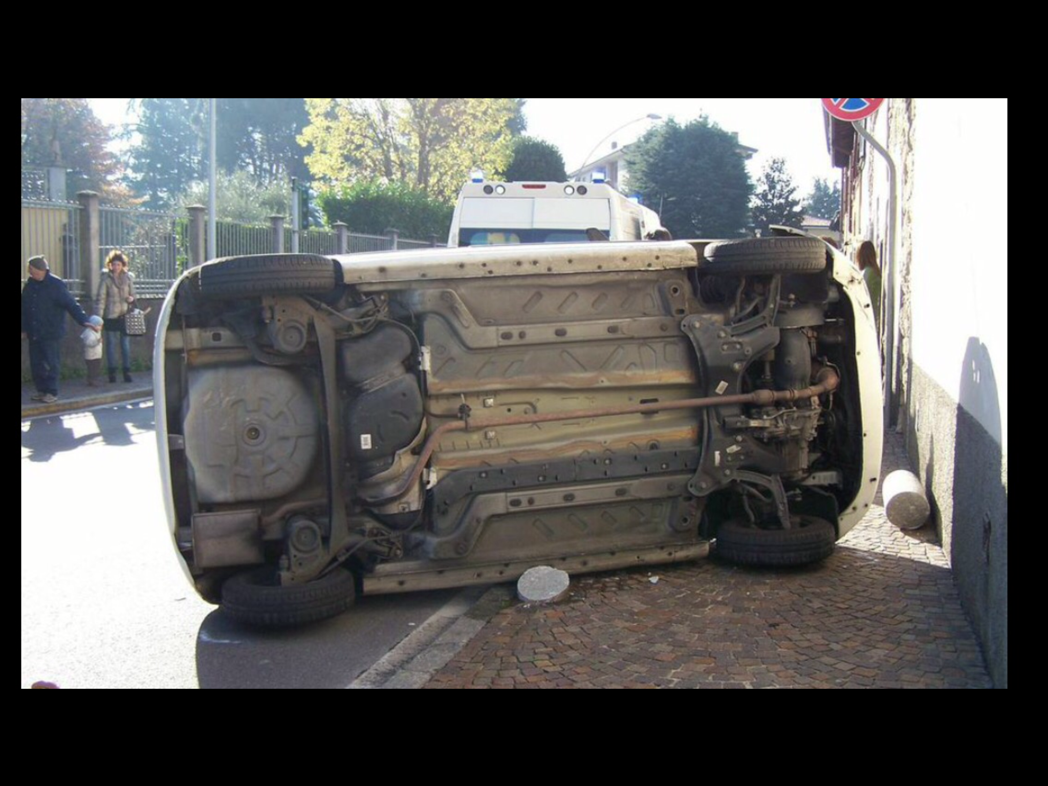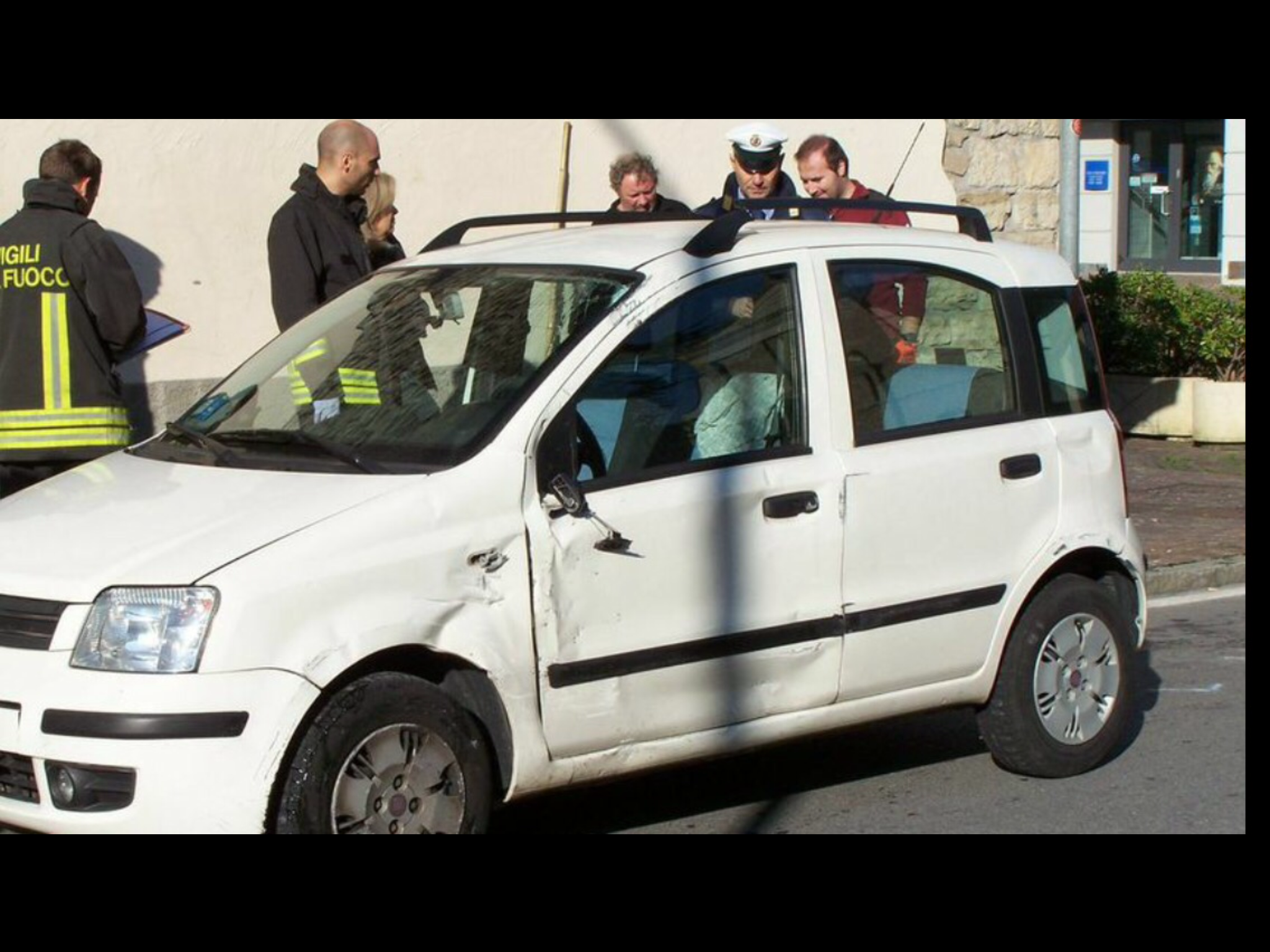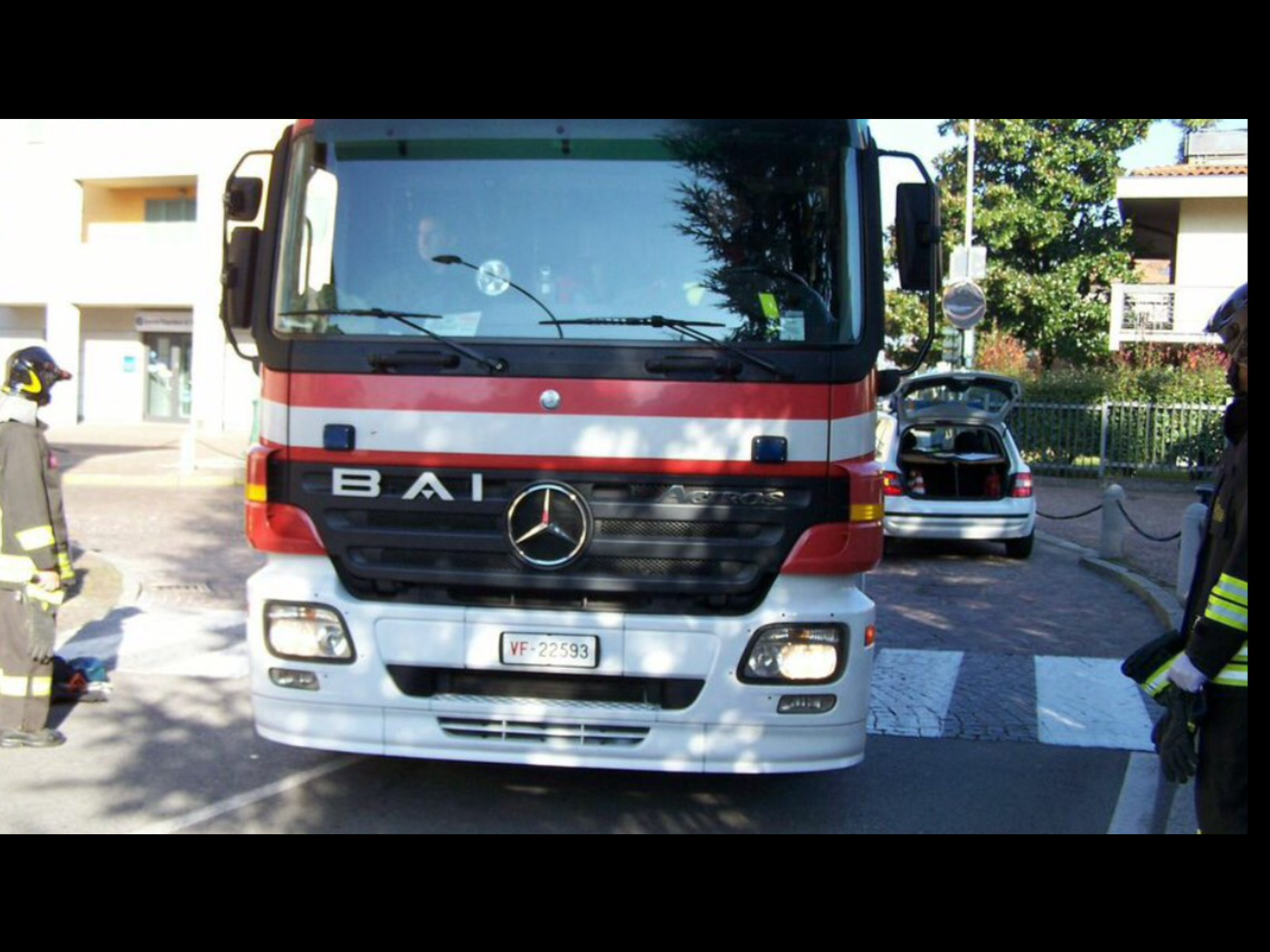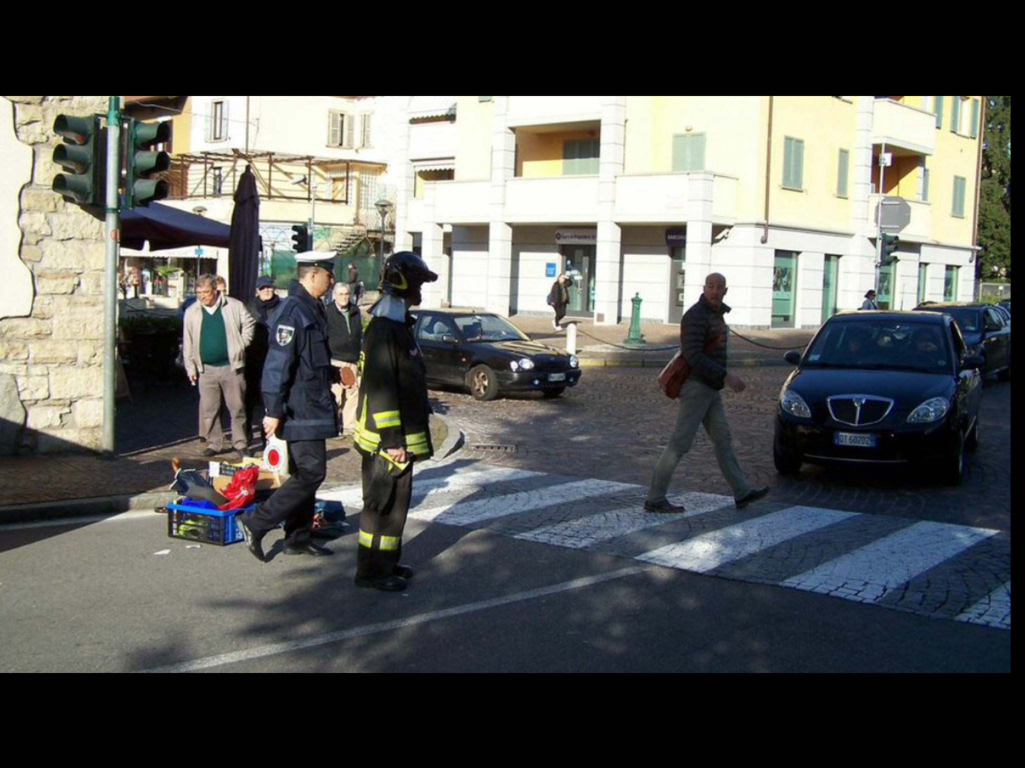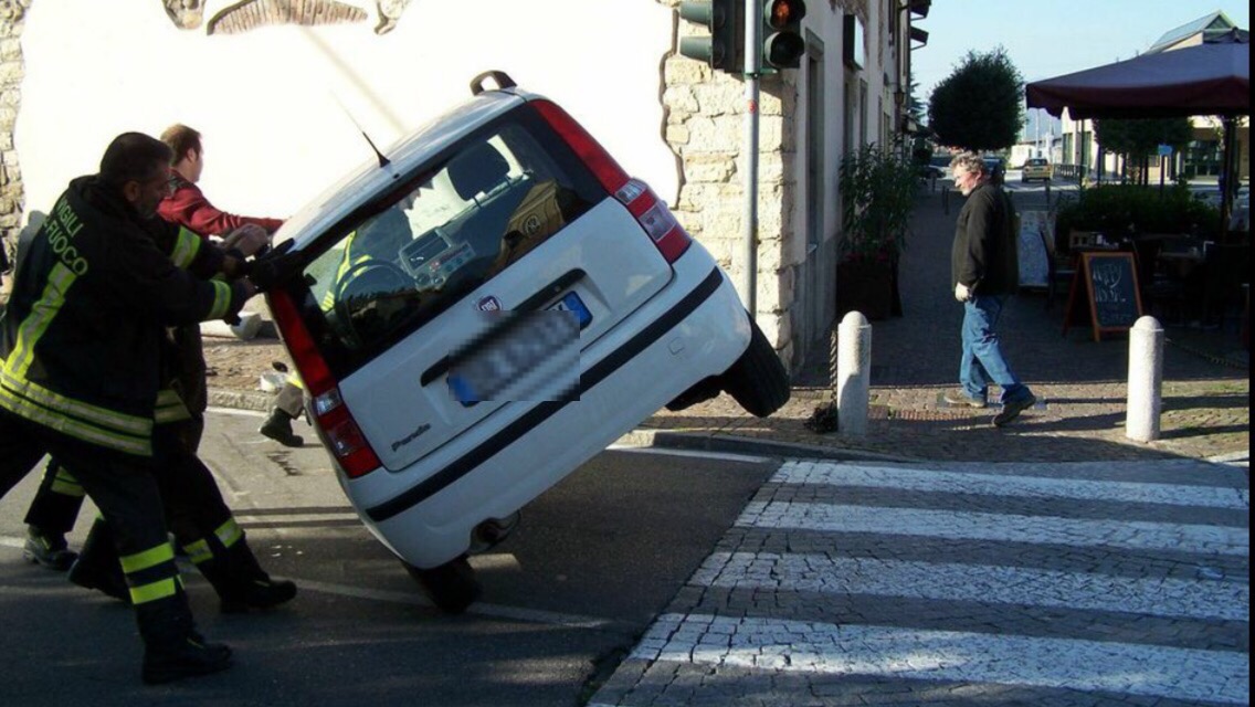 “ore 10.45 piazza Trieste angolo Via Piatti, scontro e ribaltamento Fiat Panda senza gravi conseguenze per il conducente. La vettura ha tranciato il pilastro di cemento occupando il marciapiedi fortunatamente senza persone in transito in quel momento. Presenti Vigili del Fuoco e ambulanza che ha soccorso l’autista lievemente ferito .” (Foto Luigi Rota)