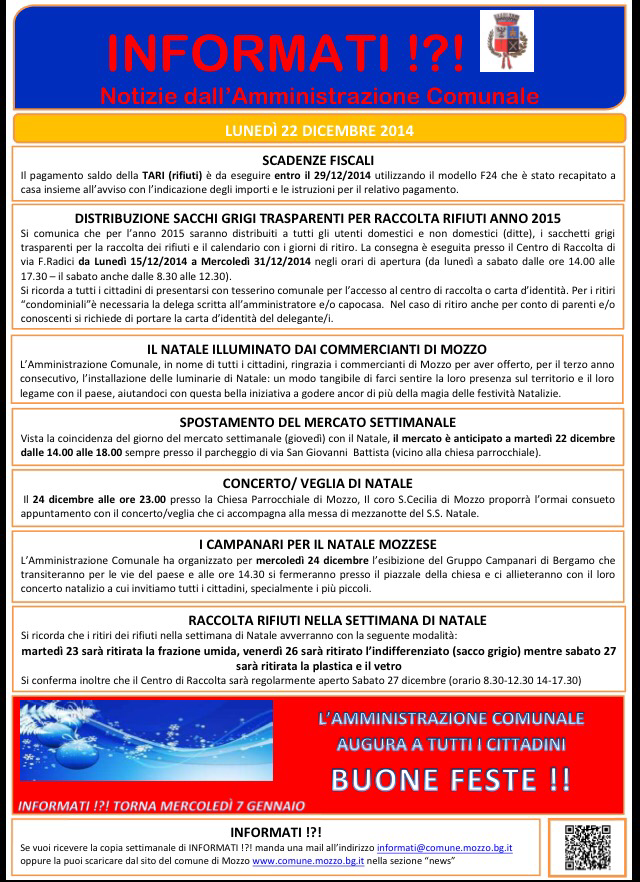 Mozzo/Comune: INFORMATI DEL 22 dicembre 2014 admin23 dicembre 201422 dicembre 2014blog post Navigazione articoli PrecedenteContinua Condividi:CondivisioneTweet Fai clic qui per stampare (Si apre in una nuova finestra) Stampa Fai clic per inviare un link a un amico via e-mail (Si apre in una nuova finestra) E-mail Mi piace Caricamento... Correlati