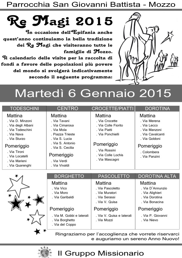 Mozzo/Epifania: arrivano i Re Magi nei quartieri del paese. admin5 gennaio 2015blog post Navigazione articoli PrecedenteContinua . Condividi:CondivisioneTweet Fai clic qui per stampare (Si apre in una nuova finestra) Stampa Fai clic per inviare un link a un amico via e-mail (Si apre in una nuova finestra) E-mail Mi piace Caricamento... Correlati