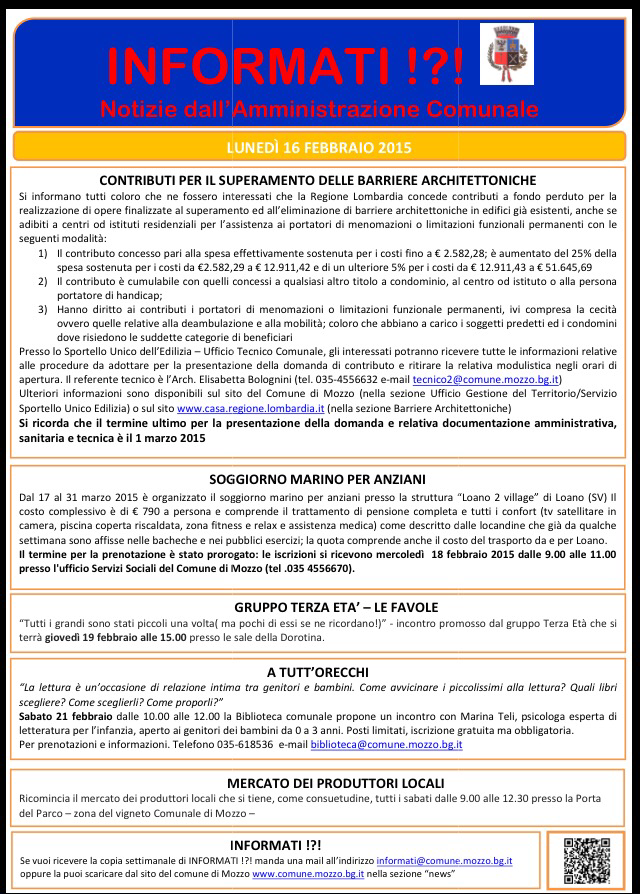 Mozzo/Comune: INFORMATI del 16 febbraio admin17 febbraio 2015blog post Navigazione articoli PrecedenteContinua . Condividi:CondivisioneTweet Fai clic qui per stampare (Si apre in una nuova finestra) Stampa Fai clic per inviare un link a un amico via e-mail (Si apre in una nuova finestra) E-mail Mi piace Caricamento... Correlati