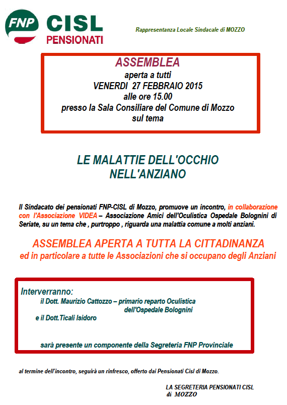 Mozzo/Cisl: “LE MALATTIE DELL’OCCHIO NELL’ANZIANO” il 27 febbraio admin20 febbraio 201519 febbraio 2015blog post Navigazione articoli PrecedenteContinua Condividi:CondivisioneTweet Fai clic qui per stampare (Si apre in una nuova finestra) Stampa Fai clic per inviare un link a un amico via e-mail (Si apre in una nuova finestra) E-mail Mi piace Caricamento... Correlati