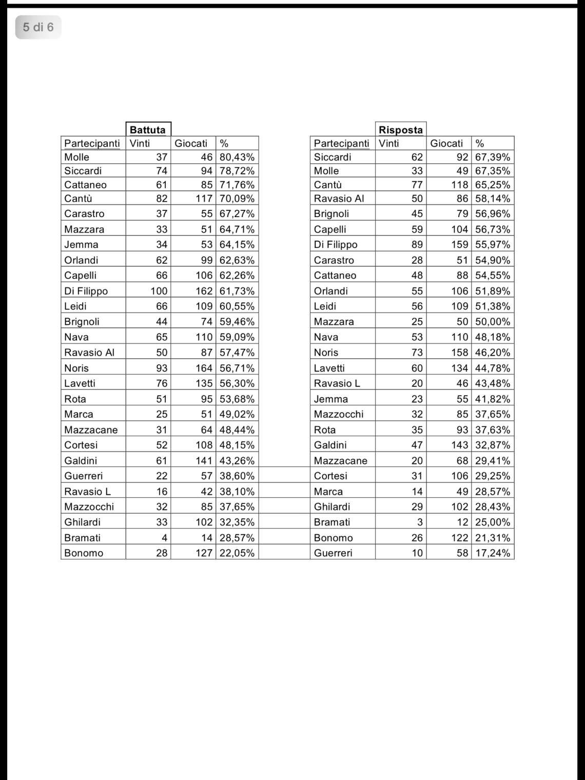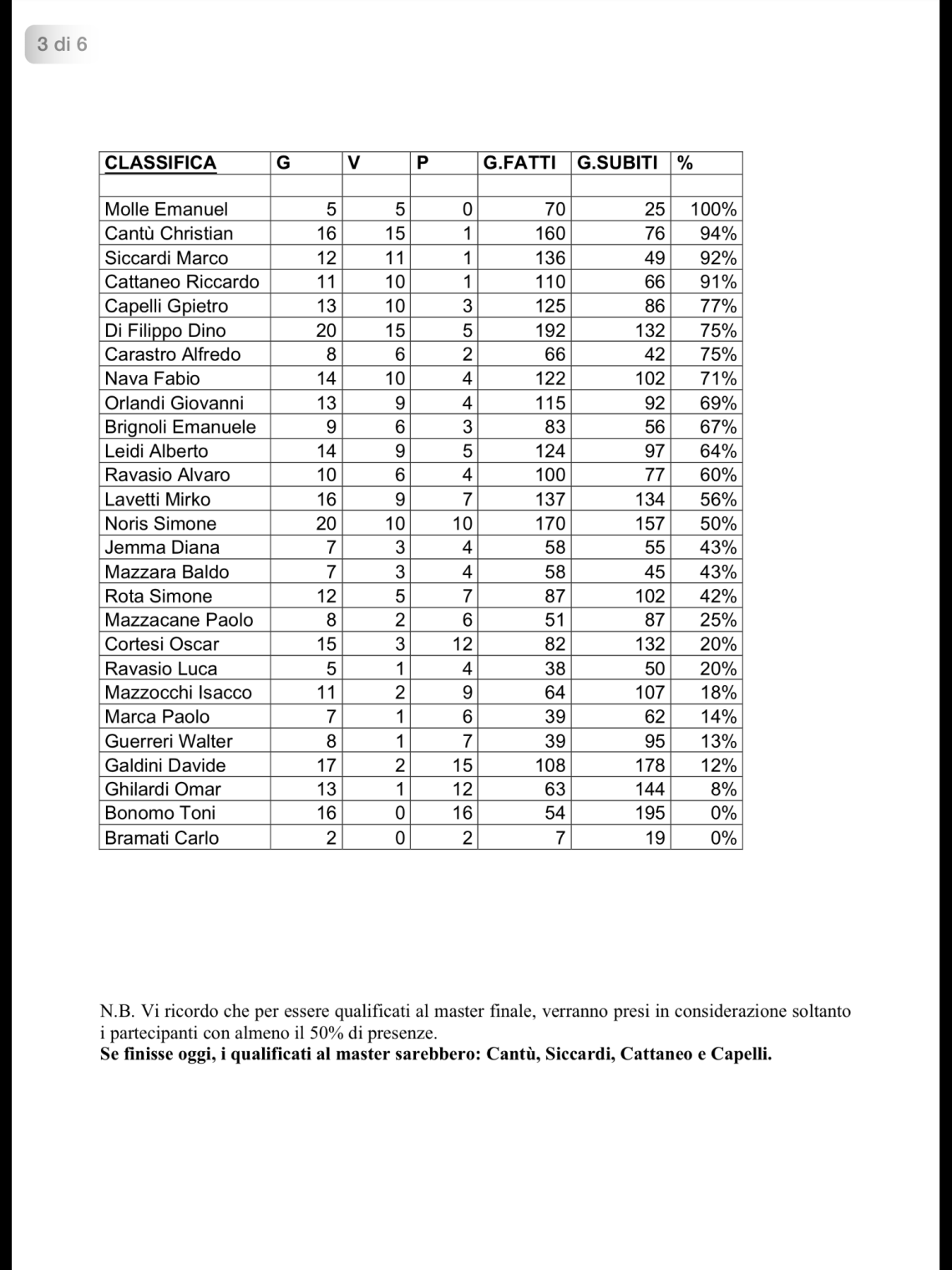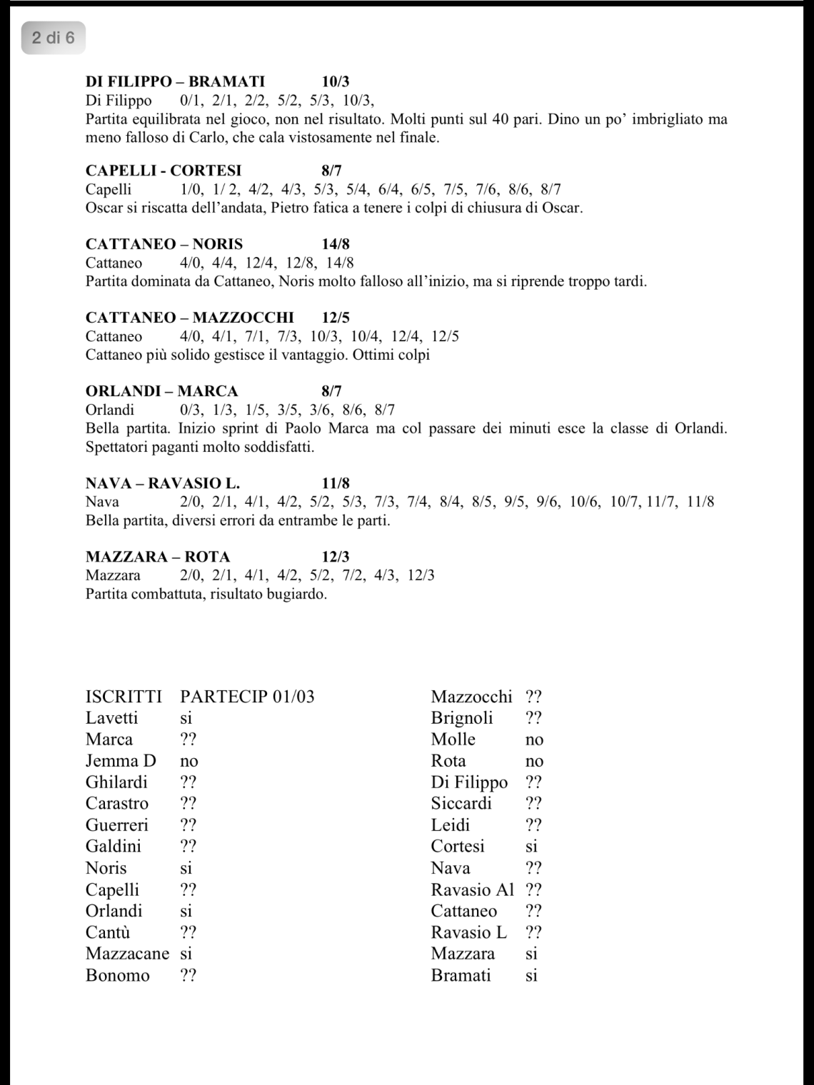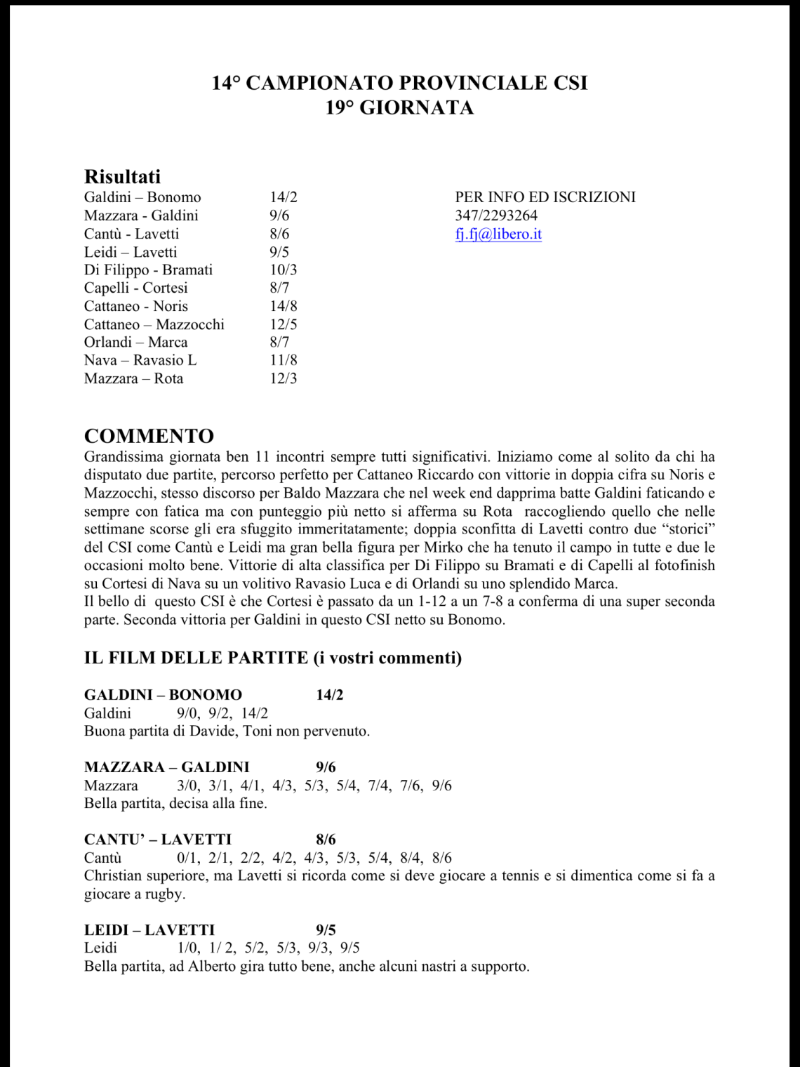 Grandissima giornata ben 11 incontri sempre tutti significativi. Iniziamo come al solito da chi ha disputato due partite, percorso perfetto per Cattaneo Riccardo con vittorie in doppia cifra su Noris e Mazzocchi, stesso discorso per Baldo Mazzara che nel week end dapprima batte Galdini faticando e sempre con fatica ma con punteggio più netto si afferma su Rota raccogliendo quello che nelle settimane scorse gli era sfuggito immeritatamente; doppia sconfitta di Lavetti contro due “storici” del CSI come Cantù e Leidi ma gran bella figura per Mirko che ha tenuto il campo in tutte e due le occasioni molto bene. Vittorie di alta classifica per Di Filippo su Bramati e di Capelli al fotofinish su Cortesi di Nava su un volitivo Ravasio Luca e di Orlandi su uno splendido Marca.