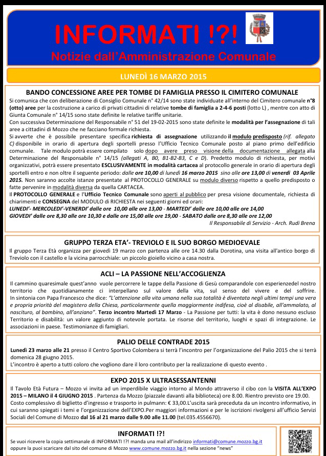 Mozzo/Comune: INFORMATI del 16 marzo admin17 marzo 2015blog post Navigazione articoli PrecedenteContinua Condividi:CondivisioneTweet Fai clic qui per stampare (Si apre in una nuova finestra) Stampa Fai clic per inviare un link a un amico via e-mail (Si apre in una nuova finestra) E-mail Mi piace Caricamento... Correlati