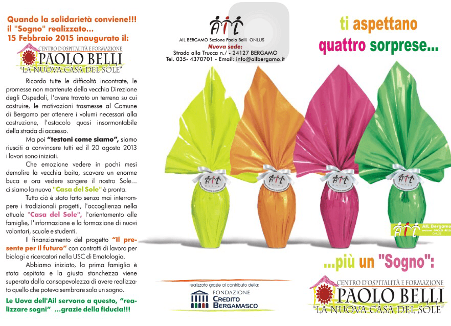Domani 21 marzo e domenica 22 marzo, tornano le uova di cioccolato dell’associazione Paolo Belli! La Nuova Casa del Sole è già operativa pur non dimenticando tutti gli altri progetti di assistenza che sono in corso ed il mantenimento dei laboratori ematologici.”