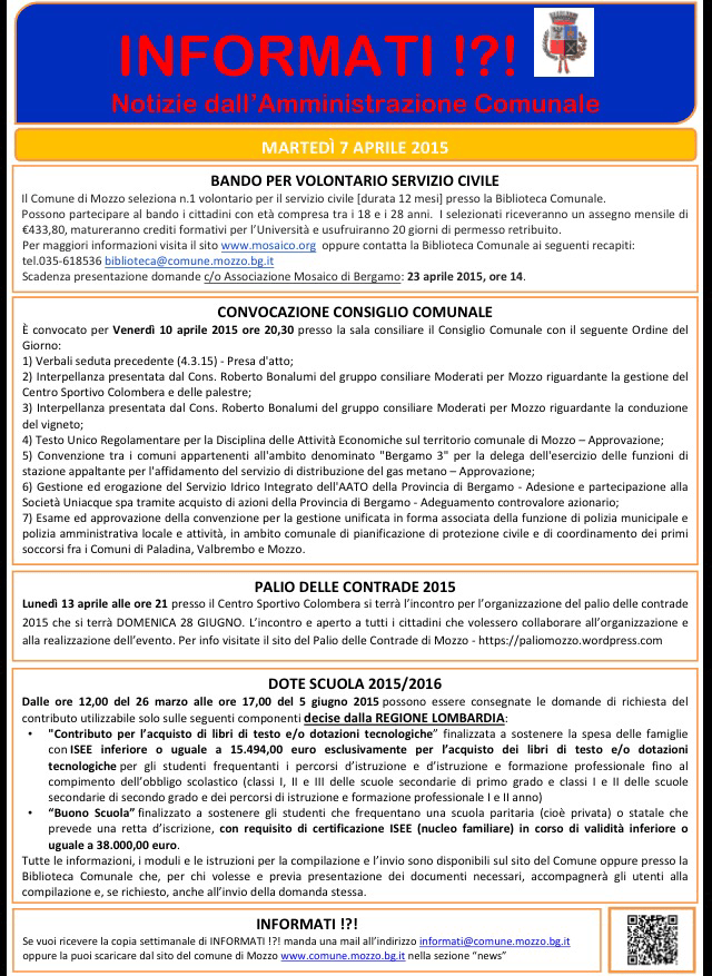 Mozzo/Comune: INFORMATI del 7 aprile 2015 admin8 aprile 2015blog post Navigazione articoli PrecedenteContinua Condividi:CondivisioneTweet Fai clic qui per stampare (Si apre in una nuova finestra) Stampa Fai clic per inviare un link a un amico via e-mail (Si apre in una nuova finestra) E-mail Mi piace Caricamento... Correlati