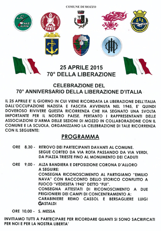 Mozzo/25 Aprile: riconoscimento al nostro Gastaldi Luigi prigioniero in lager in Algeria fino al ’46 | blog del Bersagliere Mozzo admin10 aprile 201510 aprile 2015blog post Navigazione articoli PrecedenteContinua 25 Aprile: riconoscimento al nostro Gastaldi Luigi prigioniero in lager in Algeria fino al ’46 | blog del Bersagliere. Condividi:CondivisioneTweet Fai clic qui per stampare (Si apre in una nuova finestra) Stampa Fai clic per inviare un link a un amico via e-mail (Si apre in una nuova finestra) E-mail Mi piace Caricamento... Correlati