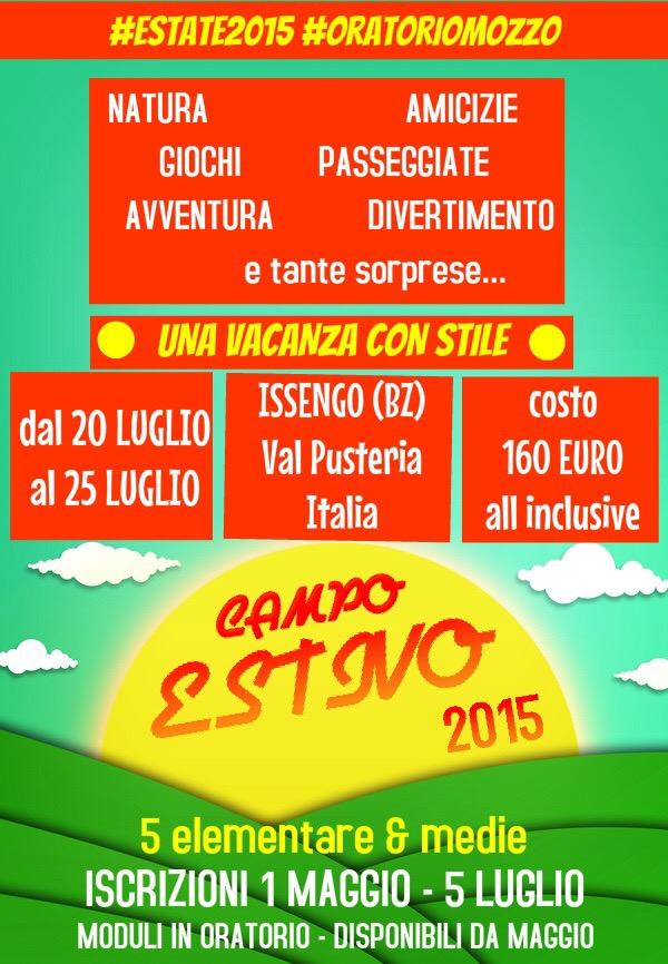 Mozzo/Oratorio: Campo estivo 2015 dal 20 luglio admin15 aprile 201516 aprile 2015blog post Navigazione articoli PrecedenteContinua Qui Oratorio Mozzo Condividi:CondivisioneTweet Fai clic qui per stampare (Si apre in una nuova finestra) Stampa Fai clic per inviare un link a un amico via e-mail (Si apre in una nuova finestra) E-mail Mi piace Caricamento... Correlati
