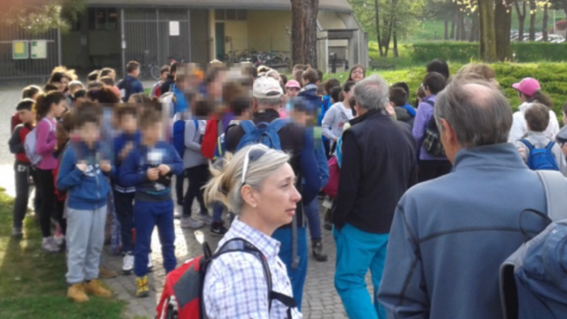 “Le classi quarte elementari in partenza con il GEM e il Corpo Forestale dello Stato in partenza per l’escursione sul Monte di Mozzo”(fotocronaca CP)