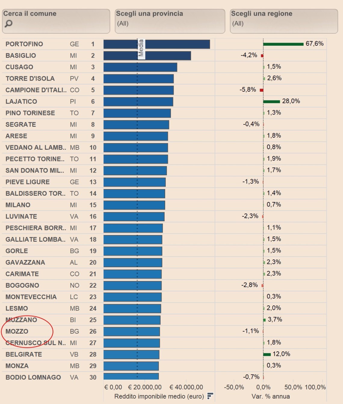 Mozzo Ricchi e poveri, la classifica dei comuni Sole 24 Ore admin17 aprile 201517 aprile 2015blog post Navigazione articoli PrecedenteContinua Ricchi e poveri, la classifica dei comuni / Portofino. Condividi:CondivisioneTweet Fai clic qui per stampare (Si apre in una nuova finestra) Stampa Fai clic per inviare un link a un amico via e-mail (Si apre in una nuova finestra) E-mail Mi piace Caricamento... Correlati