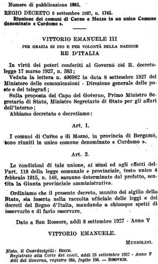 I comuni di Curno e Mozzo, riuniti col regio decreto 8 settembre 1927, n. 1745, nell’unico comune di Curdomo, sono ricostituiti con le rispettive circoscrizioni preesistenti all’entrata in vigore del decreto medesimo.