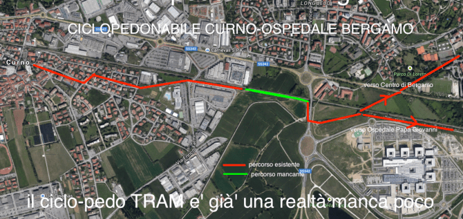 e arriva dietro allo Sport Piu, poi a fianco della ferrovia nella zona artigianale: manca un piccolo pezzo che collega questa zona al sottopasso che si collega al sedime già’ esistente o verso l’Ospedale o verso i campi da tennis di Loreto, ci vorrebbe poco da parte del Comune per dare la possibilità’ a chi deve andare in centro di Bergamo o all’Ospedale di utilizzare la bici in tutta sicurezza su un percorso “Green” al 90% già’ esistente. Perché non si fa?”
