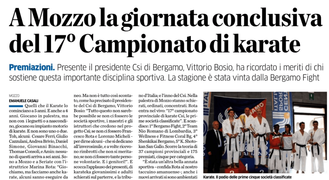 Mozzo/Karate: ” A Mozzo la giornata conclusiva del 17 Campionato di Karate” oggi su L’Eco di Bergamo in edicola admin3 giugno 2015blog post Navigazione articoli PrecedenteContinua Condividi:CondivisioneTweet Stampa (Si apre in una nuova finestra) Stampa Invia un link a un amico via e-mail (Si apre in una nuova finestra) E-mail Mi piace Caricamento... Correlati