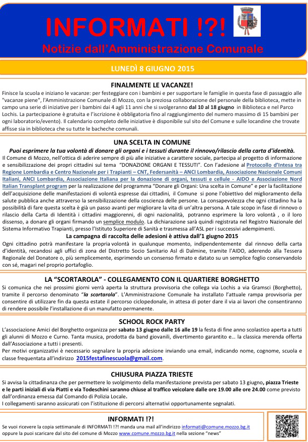 Mozzo/Comune: INFORMATI del 8 giugno 2015 admin9 giugno 2015blog post Navigazione articoli PrecedenteContinua Condividi:CondivisioneTweet Fai clic qui per stampare (Si apre in una nuova finestra) Stampa Fai clic per inviare un link a un amico via e-mail (Si apre in una nuova finestra) E-mail Mi piace Caricamento... Correlati