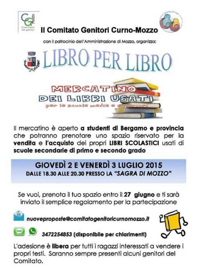 Mozzo/Scuola: Mercatino del libro usato admin18 giugno 2015blog post Navigazione articoli PrecedenteContinua Condividi:CondivisioneTweet Fai clic qui per stampare (Si apre in una nuova finestra) Stampa Fai clic per inviare un link a un amico via e-mail (Si apre in una nuova finestra) E-mail Mi piace Caricamento... Correlati