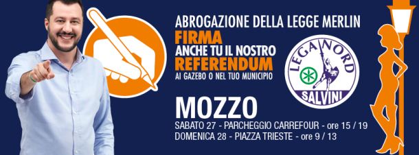 Mozzo/Politica: raccolta firma sabato e domenica gazebo Lega Nord admin26 giugno 2015blog post Navigazione articoli PrecedenteContinua riceviamo comunicato publichiamo: SABATO 27 DALLE 15:00 ALLE 19:00 PARCHEGGIO CARREFOUR DOMENICA 28 DALLE 9:00 ALLE 13:00 PIAZZA TRIESTE Condividi:CondivisioneTweet Fai clic qui per stampare (Si apre in una nuova finestra) Stampa Fai clic per inviare un link a un amico via e-mail (Si apre in una nuova finestra) E-mail Mi piace Caricamento... Correlati