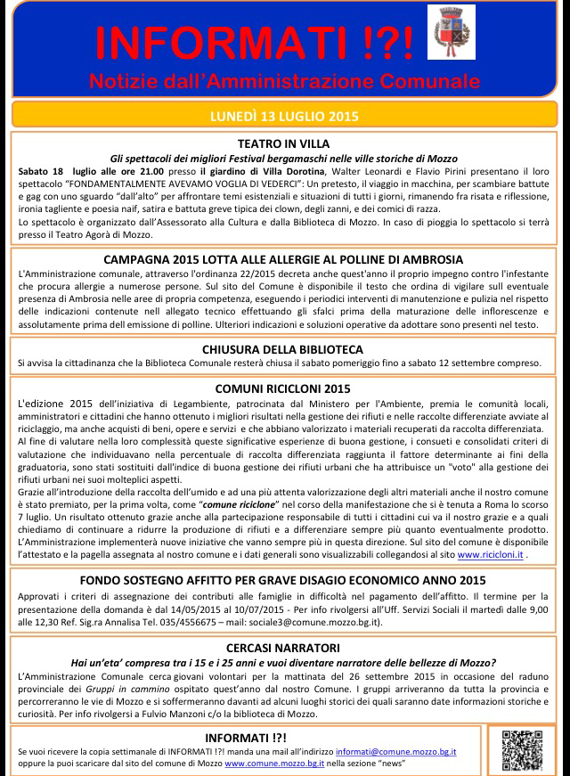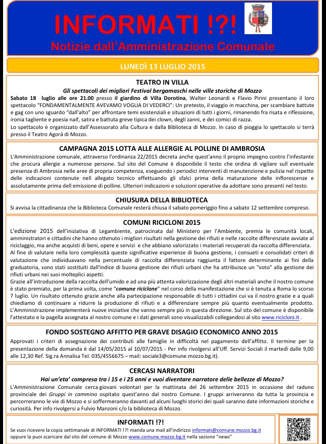 Mozzo/Comune: Informati del 13 luglio 2013 admin14 luglio 2015blog post Navigazione articoli PrecedenteContinua Condividi:CondivisioneTweet Fai clic qui per stampare (Si apre in una nuova finestra) Stampa Fai clic per inviare un link a un amico via e-mail (Si apre in una nuova finestra) E-mail Mi piace Caricamento... Correlati