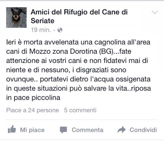 “Ieri è morta avvelenata una cagnolina all’area cani di Mozzo zona Dorotina (BG)…fate attenzione ai vostri cani e non fidatevi mai di niente e di nessuno, i disgraziati sono ovunque.. portatevi dietro l’acqua ossigenata in queste situazioni può salvare la vita..” UPDATE: verifiche in corso e non sembra che nessuna cagnolina sia morta.