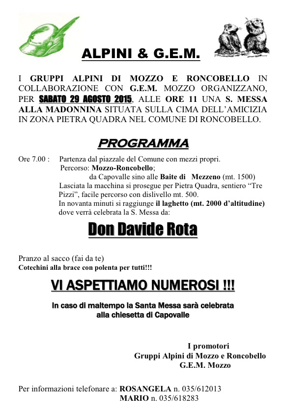 Mozzo/Gem-Alpini: a Roncobello il 29 agosto admin27 agosto 2015blog post Navigazione articoli PrecedenteContinua Condividi:CondivisioneTweet Fai clic qui per stampare (Si apre in una nuova finestra) Stampa Fai clic per inviare un link a un amico via e-mail (Si apre in una nuova finestra) E-mail Mi piace Caricamento... Correlati