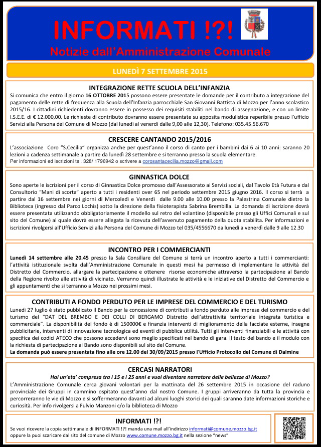 Mozzo/Comune: INFORMATI del 7 settembre 2015 admin8 settembre 2015blog post Navigazione articoli PrecedenteContinua Condividi:CondivisioneTweet Fai clic qui per stampare (Si apre in una nuova finestra) Stampa Fai clic per inviare un link a un amico via e-mail (Si apre in una nuova finestra) E-mail Mi piace Caricamento... Correlati