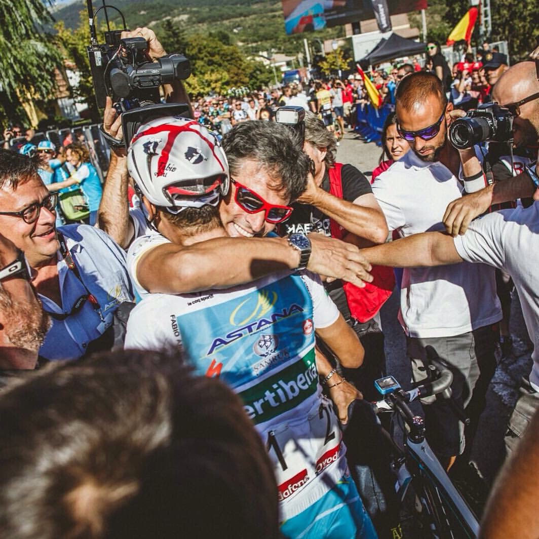 “Il nostro concittadino Umberto Inselvini, massaggiatore Astana, uno dei protagonisti del successo di un sogno: nelle immagini l’abbraccio con il vincitore della Vuelta, Fabio Aru” (foto live per gentile concessione di Umberto Inselvini)