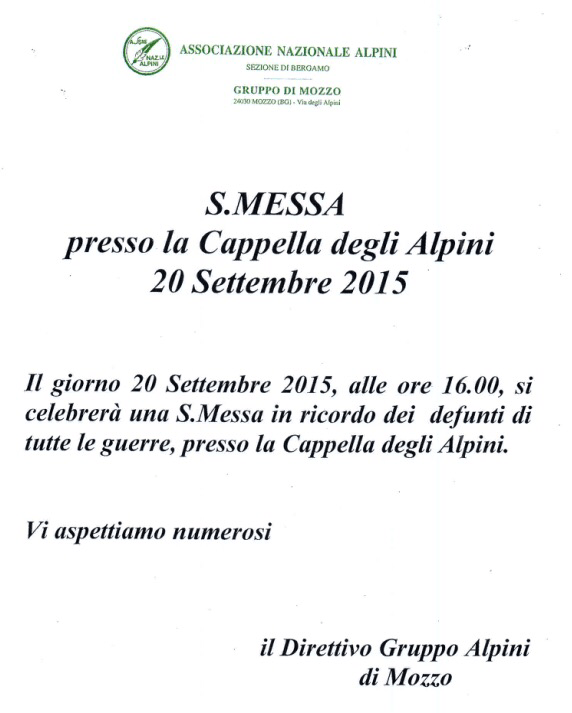 Mozzo/Alpini: Santa Messa ricordo Caduti Il 20 settembre admin17 settembre 2015blog post Navigazione articoli PrecedenteContinua Condividi:CondivisioneTweet Fai clic qui per stampare (Si apre in una nuova finestra) Stampa Fai clic per inviare un link a un amico via e-mail (Si apre in una nuova finestra) E-mail Mi piace Caricamento... Correlati