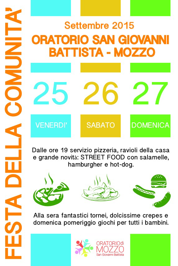 Mozzo/Oratorio: StreetFood 2015 admin21 settembre 201520 settembre 2015blog post Navigazione articoli PrecedenteContinua Condividi:CondivisioneTweet Fai clic qui per stampare (Si apre in una nuova finestra) Stampa Fai clic per inviare un link a un amico via e-mail (Si apre in una nuova finestra) E-mail Mi piace Caricamento... Correlati