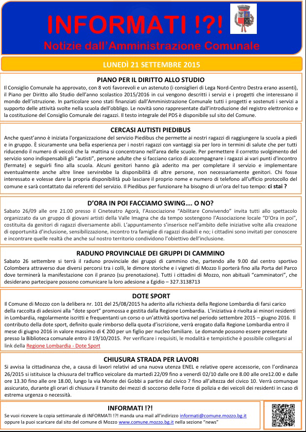 Mozzo/Comune: INFORMATI DEL 21 settembre admin22 settembre 2015blog post Navigazione articoli PrecedenteContinua Condividi:CondivisioneTweet Fai clic qui per stampare (Si apre in una nuova finestra) Stampa Fai clic per inviare un link a un amico via e-mail (Si apre in una nuova finestra) E-mail Mi piace Caricamento... Correlati