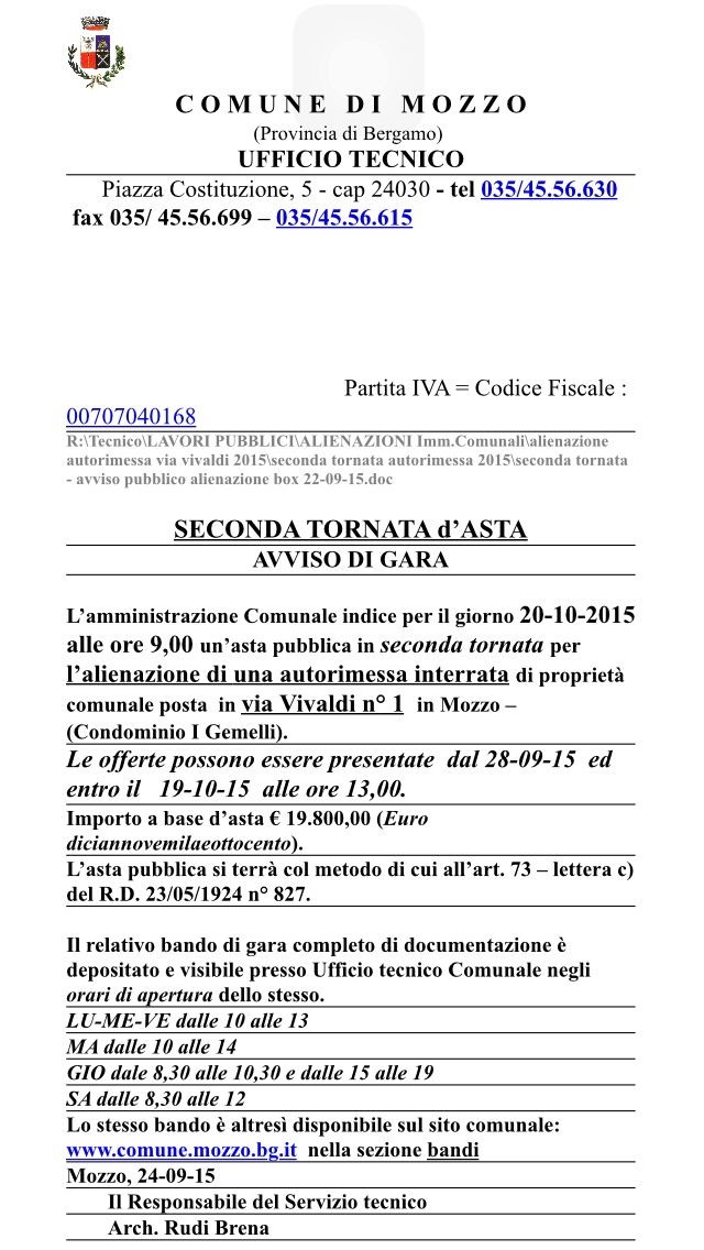 Mozzo/Comune: autorimessa comunale in Via Vivaldi all’asta admin28 settembre 2015blog post Navigazione articoli PrecedenteContinua Mi piace Caricamento... Correlati
