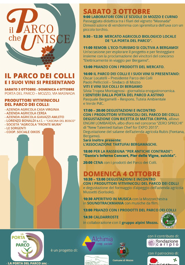 Mozzo/Borghetto: Il Parco dei Colli e i suoi vini si presentano alla Porta del Parco admin29 settembre 2015blog post Navigazione articoli PrecedenteContinua Condividi:CondivisioneTweet Fai clic qui per stampare (Si apre in una nuova finestra) Stampa Fai clic per inviare un link a un amico via e-mail (Si apre in una nuova finestra) E-mail Mi piace Caricamento... Correlati