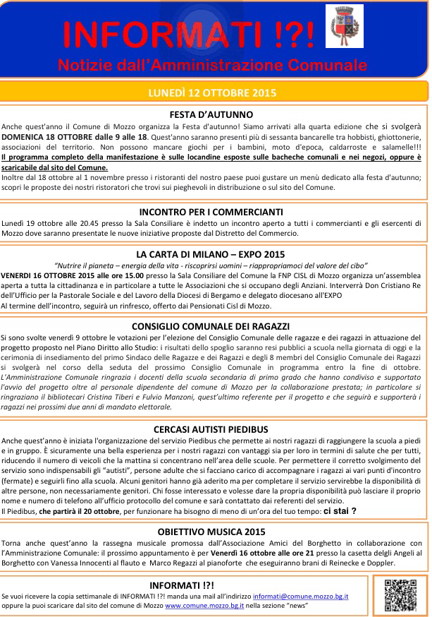 Mozzo/Comune: INFORMATI del 12 ottobre 2015 admin13 ottobre 2015blog post Navigazione articoli PrecedenteContinua Condividi:CondivisioneTweet Fai clic qui per stampare (Si apre in una nuova finestra) Stampa Fai clic per inviare un link a un amico via e-mail (Si apre in una nuova finestra) E-mail Mi piace Caricamento... Correlati