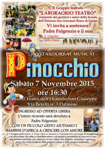 musical di Pinocchio organizzato dai genitori della scuola per l’infanzia San Giovanni Bosco di Curno il cui ricavato sarà devoluto al “Villaggio della Gioia” onlus gestito da padre Fulgenzio in Tanzania.