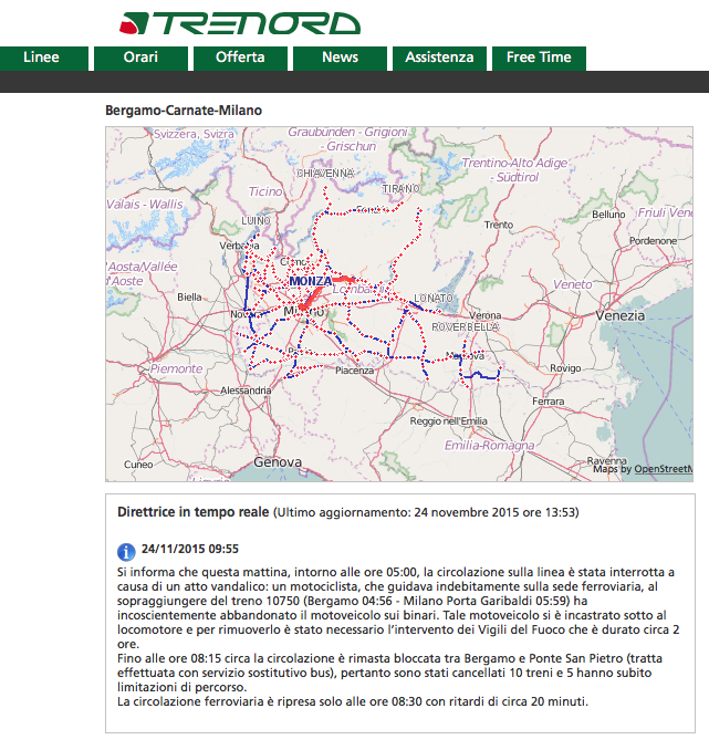 “Si informa che questa mattina, intorno alle ore 05:00, la circolazione sulla linea è stata interrotta a causa di un atto vandalico: un motociclista, che guidava indebitamente sulla sede ferroviaria, al sopraggiungere del treno 10750 (Bergamo 04:56 – Milano Porta Garibaldi 05:59) ha incoscientemente abbandonato il motoveicolo sui binari. Tale motoveicolo si è incastrato sotto al locomotore e per rimuoverlo è stato necessario l’intervento dei Vigili del Fuoco che è durato circa 2 ore. Fino alle ore 08:15 circa la circolazione è rimasta bloccata tra Bergamo e Ponte San Pietro (tratta effettuata con servizio sostitutivo bus), pertanto sono stati cancellati 10 treni e 5 hanno subito limitazioni di percorso. La circolazione ferroviaria è ripresa solo alle ore 08:30 con ritardi di circa 20 minuti.”