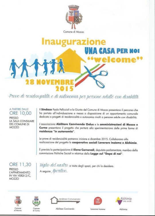Mozzo/Abilitare Convivendo: Inauguarata “una casa per Noi” questa mattina in Via Verdi admin28 novembre 201528 novembre 2015blog post Navigazione articoli PrecedenteContinua Tutte le immagini di Luigi Rota Condividi:CondivisioneTweet Fai clic qui per stampare (Si apre in una nuova finestra) Stampa Fai clic per inviare un link a un amico via e-mail (Si apre in una nuova finestra) E-mail Mi piace Caricamento... Correlati