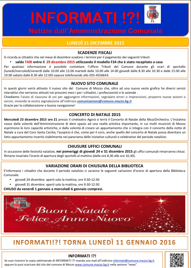 Mozzo/Comune: INFORMATI del 21 dicembre admin22 dicembre 2015blog post Navigazione articoli PrecedenteContinua Condividi:CondivisioneTweet Fai clic qui per stampare (Si apre in una nuova finestra) Stampa Fai clic per inviare un link a un amico via e-mail (Si apre in una nuova finestra) E-mail Mi piace Caricamento... Correlati