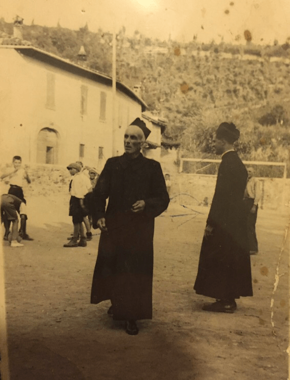 “Il parroco, i ragazzi, la via papa Giovanni (oratorio attuale) e il colle..La foto dei ricordi (1947 foto di Filippo Ubiali) il campetto di calcio oggi parcheggio sotto il campanile- Parroco don Egidio Grassi, curato don Angelo Merelli”