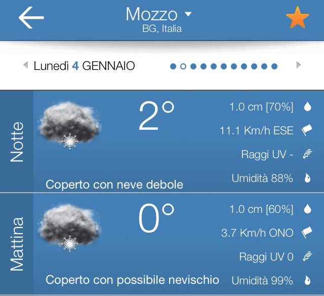 Il Meteo di domani a Mozzo. ∗ Mattino: 0°C, Coperto con possibile nevischio; Pomeriggio: 3°C, Molto nuvoloso o coperto; Sera: 1°C, Nebbie o nubi basse con qualche schiarita; Notte: 1°C, Sereno con foschia.