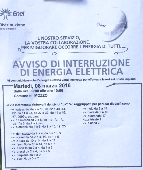 Mozzo/Via Todeschini: interruzione energia elettrica 8 marzo admin4 marzo 2016blog post Navigazione articoli PrecedenteContinua Enel comunica che dalle 9 alle 10 del 8 marzo verrà interrotta energia in via Todeschini e laterali come da volantino Condividi:CondivisioneTweet Fai clic qui per stampare (Si apre in una nuova finestra) Stampa Fai clic per inviare un link a un amico via e-mail (Si apre in una nuova finestra) E-mail Mi piace Caricamento... Correlati
