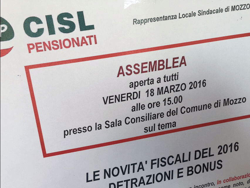 Mozzo/Cisl: il seminario con le novità fiscali. admin18 marzo 2016blog post Navigazione articoli PrecedenteContinua “Sala piena, molti i quesiti dai numerosi cittadini presenti” Condividi:CondivisioneTweet Fai clic qui per stampare (Si apre in una nuova finestra) Stampa Fai clic per inviare un link a un amico via e-mail (Si apre in una nuova finestra) E-mail Mi piace Caricamento... Correlati