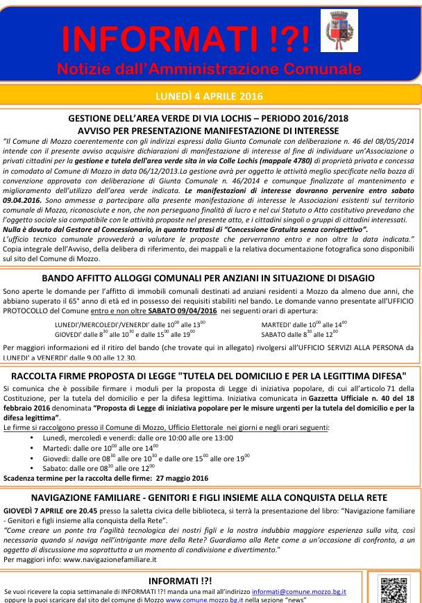 Mozzo/Comune: Informati del 4 aprile admin5 aprile 2016blog post Navigazione articoli PrecedenteContinua Condividi:CondivisioneTweet Fai clic qui per stampare (Si apre in una nuova finestra) Stampa Fai clic per inviare un link a un amico via e-mail (Si apre in una nuova finestra) E-mail Mi piace Caricamento... Correlati