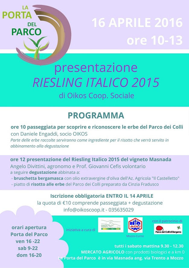 Mozzo/Vigneto: presentazione Riesling Italico 2016 admin14 aprile 2016blog post Navigazione articoli PrecedenteContinua Condividi:CondivisioneTweet Fai clic qui per stampare (Si apre in una nuova finestra) Stampa Fai clic per inviare un link a un amico via e-mail (Si apre in una nuova finestra) E-mail Mi piace Caricamento... Correlati